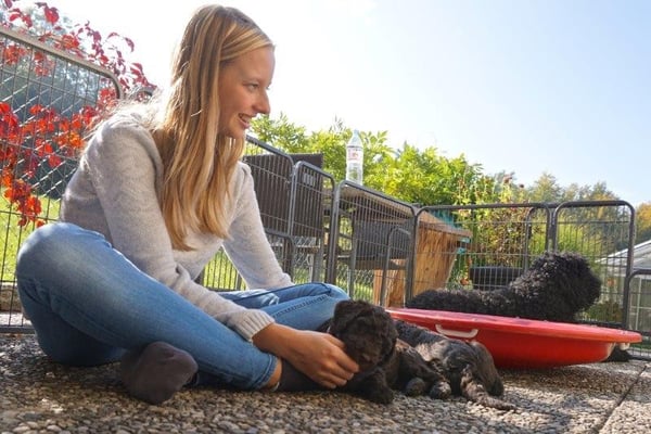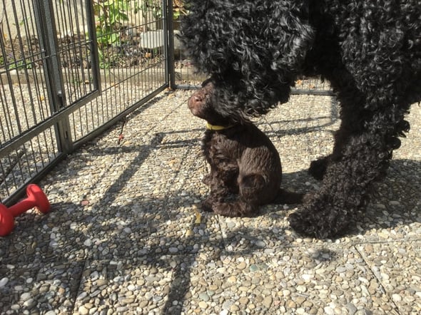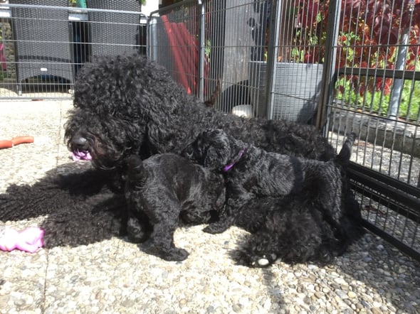 Mittlerweile sind die Welpen gross genug, um den ersten Ausflug nach draussen zu machen. Natürlich unter der dauernden Beobachtung der Mama! :-)